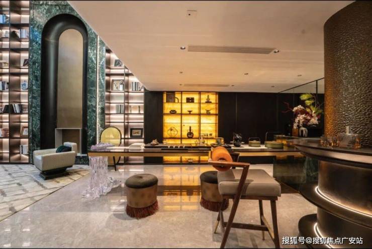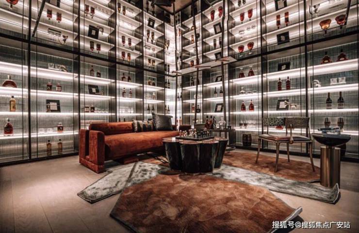 从静心凝神的茶室走几步,就到了藏酒饮酒的开放式会客空间,墙上橱柜码着主人从各处精心搜罗回来的上等佳酿。