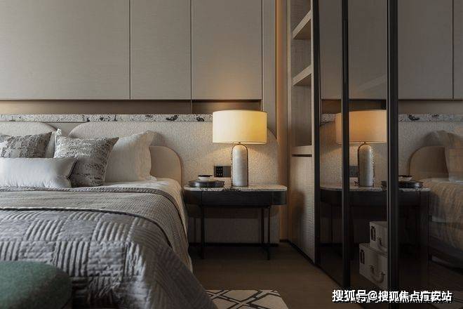 浅色系的床品与空间极致融合,木饰面搭配雪山兰奢石以深浅的明暗色调平衡臥房內的溫度,形成奢适与静雅的平衡,赋予空间深沉内敛的韵味,不失奢华。