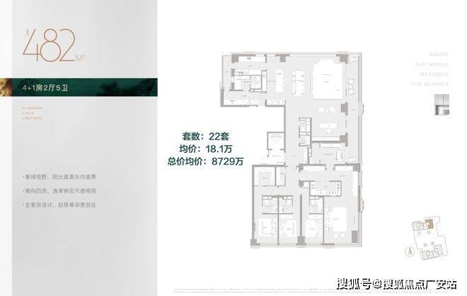 482㎡,3号楼东边套,均价18.1万,基本属于5房5卫,从这里开始,4个卧室全部套房设计,自带卫生间。