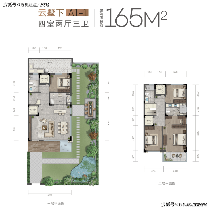 云檐里150-184m²户型全部为四房两厅三卫设计,地暖空调一应俱全,还有超大面积的私家花园。以约168m²下叠边套为例,约100+m²的私享花园庭院,以270°环绕的排布,让生活与自然融为一体。