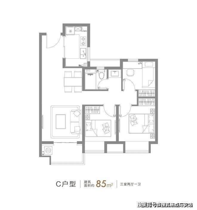 约85㎡的3房2厅1卫,三开间朝南+整体动静分离的设计,光明星城都保证了这个户型的居住舒适度。