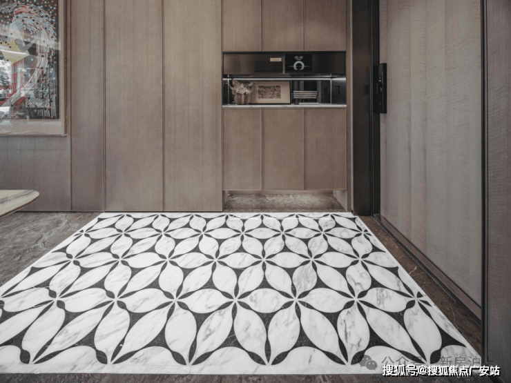 紧邻客厅的餐厅区域,同样以卡拉拉白大理石瓷砖通铺为基底,地面法式艺术拼花经典黑白细条勾勒,增添空间质感,精致而不繁杂,每一处细节都透露着挚友对高品质生活的追求。