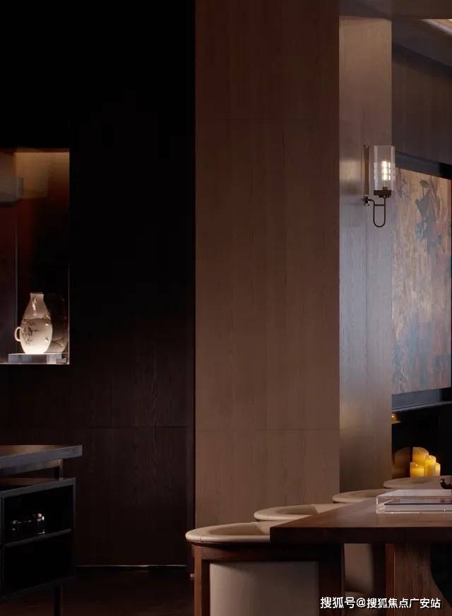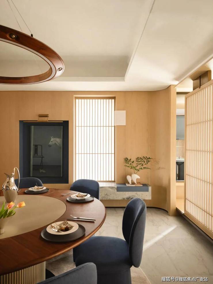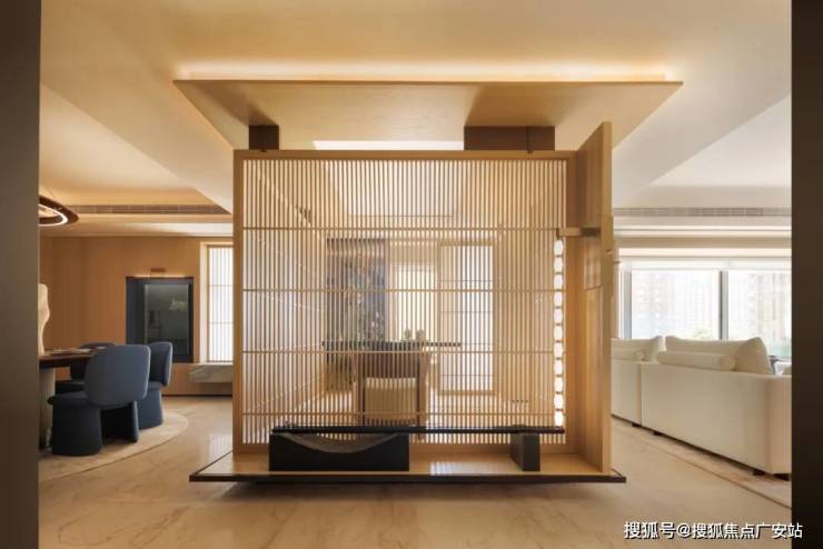 玄关右侧,华为智能光控面板辅佐,LPA熏氏大师手笔调光;夜归,步至玄关,温煦光影唤醒心扉。设计途中,琚宾沉浸游走体验,感同身受。门启,心境即安,宁静拥裹。远方超长百叶窗洒落明光,茶室宛若浮空岛屿,革新格局认知,半透屏风柔化光线,朦胧间温润弥漫。家,启程与归宿,需铭记标识。“东方气韵”标志,自茶室延伸,为空间烙刻独特记忆。