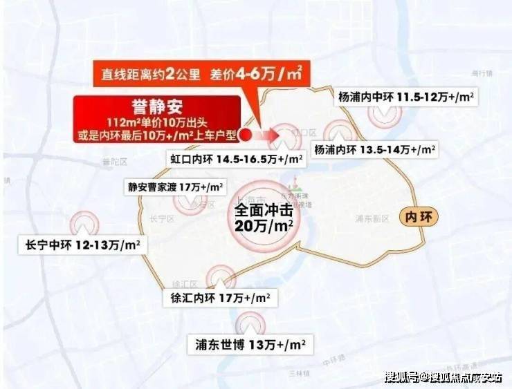 内环单价门槛清晰:黄浦全面上20万/㎡,徐汇内环17万+/㎡,静安曹家渡17万+/㎡,陆家嘴滨江约18万/㎡;虹口内环已达14.5-16.5万/㎡,与项目直线距离仅约2公里,单价高出4-6万/㎡;杨浦内环也来到13.5-14万/㎡,单价同样高出约3万/㎡;