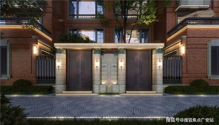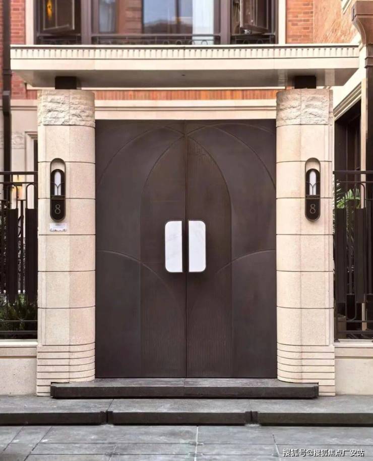 凝萃Art Deco平拱窗框、回纹山花墀头等经典元素,复刻马勒别墅的席纹拼花工艺,结合邬达克式微弧线条与墀头屋檐一体化设计,勾勒出新复古主义的精致轮廓。材质运用上,意大利金钻奢石与复古红洞石铺陈厚重质感,手工捶打铜门与双重墙体设计则彰显私密尊崇。