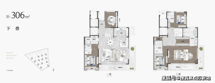 下叠拥有超大庭院,上叠有星空露台,且尺寸极大。横向巨幕开间,每一层单独拎出来都看比一套大平层。