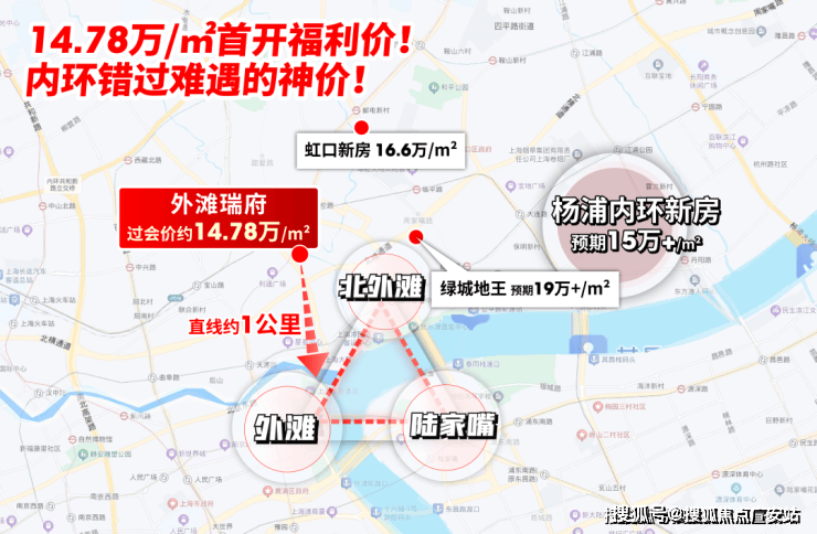 其次,在距离外滩1公里范围内,楼盘单价普遍达20万/㎡,只有外滩瑞府给出14.78万/㎡的上车机会。
