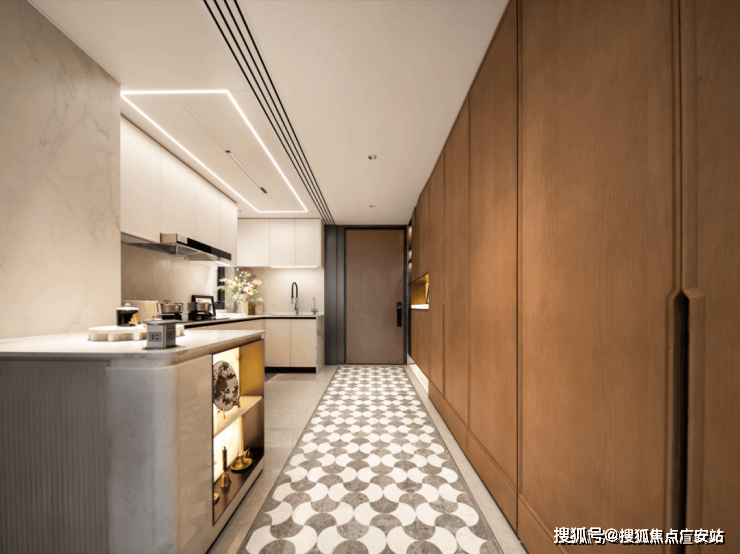 比如,定制铸铝门、专属奢石把手,进门后玄关地面设计了专属石材拼花,并定制通体玄关柜。