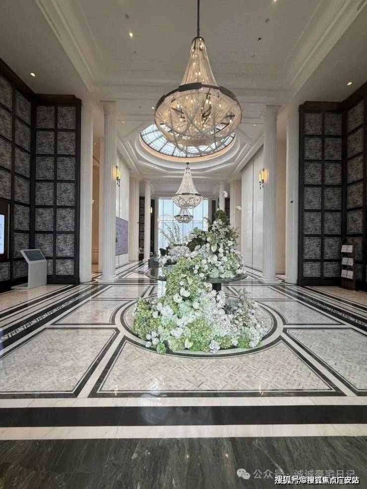 预接待厅地面瓷砖采用威尼斯白与爵士白石材拼花设计,纯人工铺装保证花纹的奢华质感。