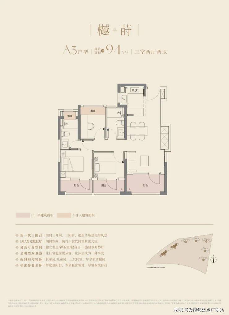 大华·望樾项目以创新理念,打造徐泾首个3.5代宅。主力户型涵盖约94-126㎡滨水公园美宅,空间设计上,采用全生命周期成长户型的理念,通过三阳台创新布局实现至高约19㎡空间拓展,为未来生活预留弹性改造可能;四开间全朝南搭配IMAX级全景窗,最大化引入自然光与日照;秉持“空间平权”理念,次卧可轻松适配双人床尺度,主卧则集合了约270°环景飘窗、独立卫浴系统及衣帽间,兼顾私密性与舒适性。
