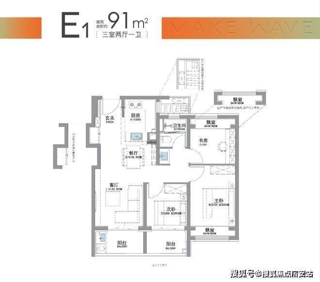 “南向双阳台+南北双飘窗”,构筑真3房户型!先来看南次卧: