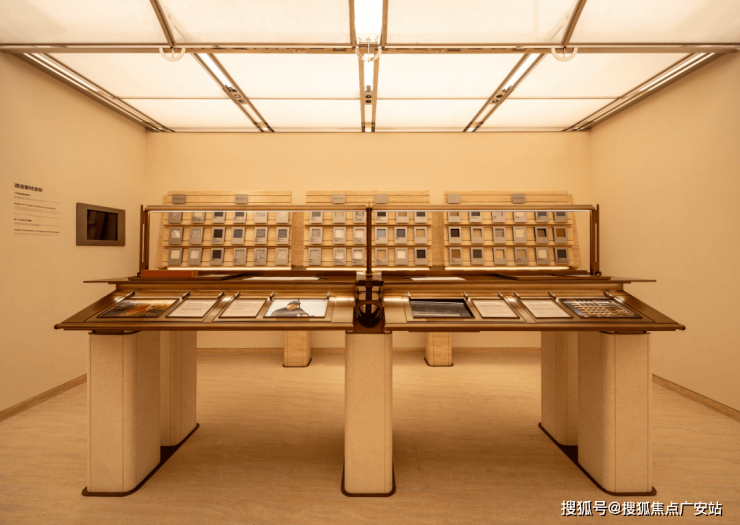 皇家白奢石、Prada绿皮革面奢石、砖纹定制铝板... 细节中透露出精致与考究。工艺工法间对72种奢材的展示,让人心悦诚服。