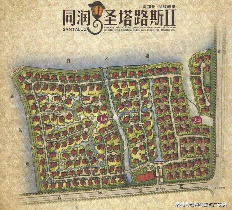 「同润·圣塔路斯」位于松江泗泾佘山版块,项目东临刘五公路、北面和西面临天然河道——泗泾塘、南临古楼公路;项目占地约26万㎡、建筑面积约10万㎡、绿化率约70%、容积率才0.3,由130套独栋别墅组成。