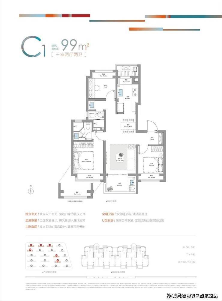建面约89㎡三房,三开间朝南+双飘窗设计,U型厨房与干湿分离卫浴兼顾功能与美学;