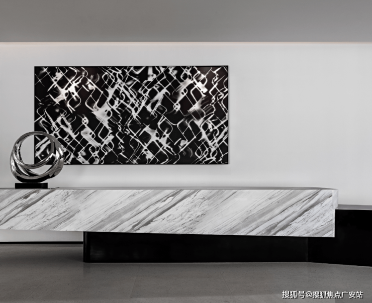 轻食吧台以不规则切割与天花相呼应,前卫且具科技感的造型与空间形成了有趣的碰撞,金属线条将深色与浅色完美过渡。