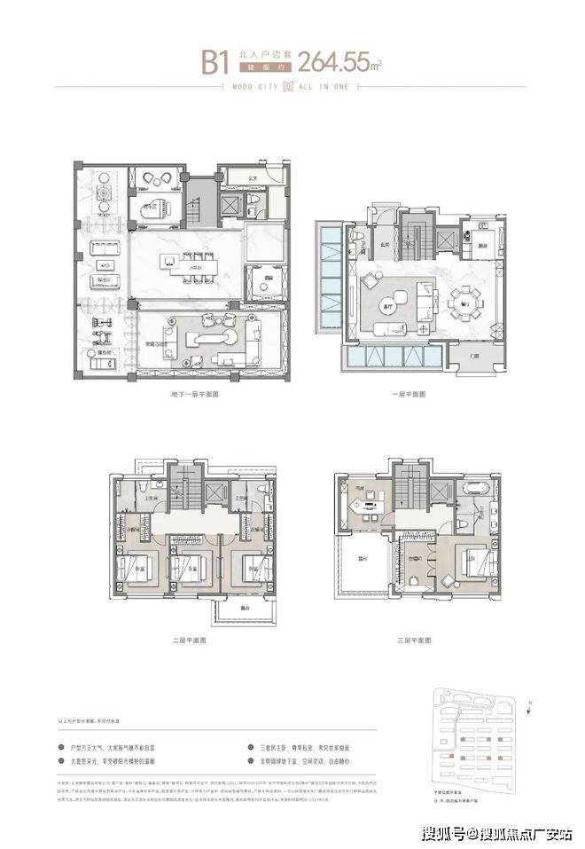 户型:建面约262-305㎡,地上三层+地下两层,层高3.6米起,地下室层高5.4米。