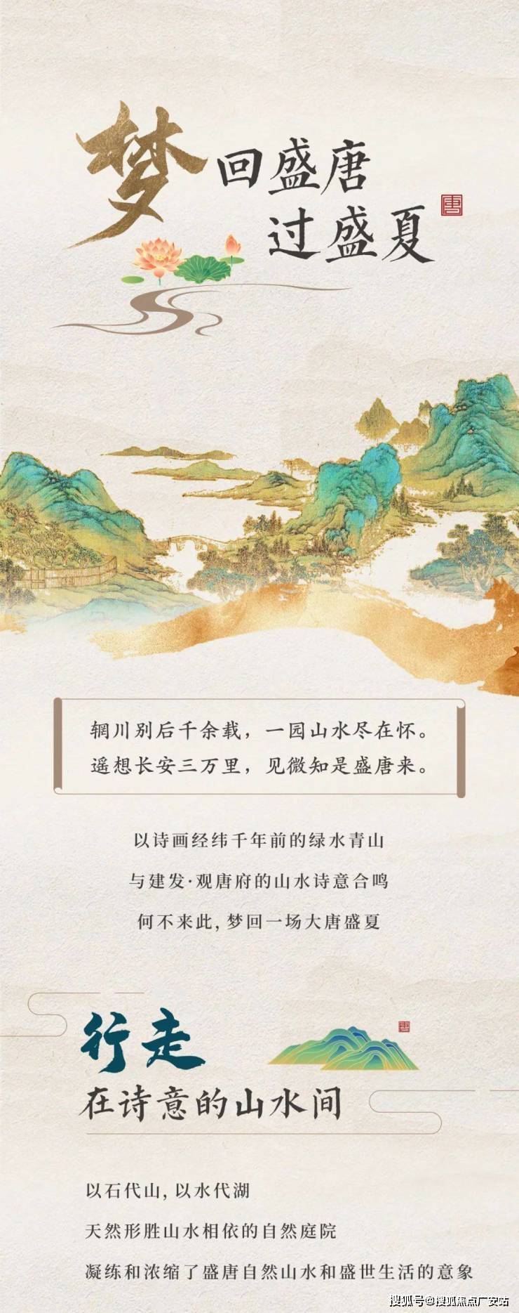 项目采用三段式入户:一进辋川入画(主入口空间),二进:闲庭碎影(戏台庭院),三进:临风听湖(自然庭院)。入户大门屋顶采用唐代“重檐歇山顶”形式配上台基上的唐代建筑标志阑干,入院后有一副唐风画作,其次以亭台楼榭、理水叠山的中国园林意境,重现盛唐大明宫百花争艳,小桥流水,落叶如金的景观。社区景观层层递进,让住户置身其中,体验唐风山水。