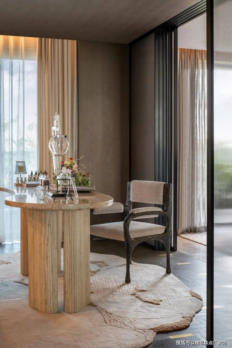 空间似一张温柔的宣纸铺展开来,金属与皮革、石材与绿植,刚与柔、曲与直,写意空间里的诗意山水,极致简化的线条与体块共筑一处静谧场域。
