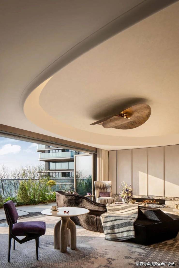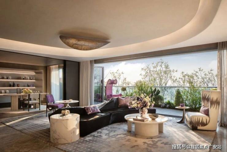 茶几与边几高低错落,两把紫色单椅如音符跃动其间,丝绒、大理石、藤编等不同材质在空间中完美融合。于此,对望窗外苍翠绿意,品一杯红酒,伴着优雅的轻音乐,艺术与酒杯触发一场诗意的对话。