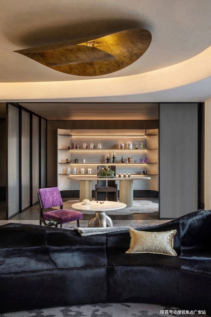 以极致简约的黑白为舞台背景,通过精炼的几何线条、先锋的艺术装置、考究的材质对比塑造强烈的现代艺术氛围。紫色作为唯一跳色,如同点睛之笔,贯穿空间,既象征艺术的不羁与神秘,又为冷静的空间注入活力与社交温度,激发居住者的交流欲望与艺术共鸣。