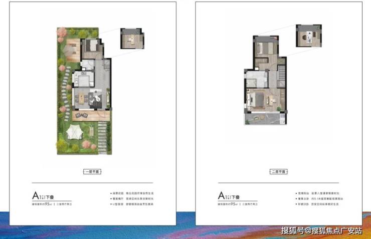 来看户型,面积段有两种——建面约95㎡下叠、上叠;建面约150㎡下叠、上叠。