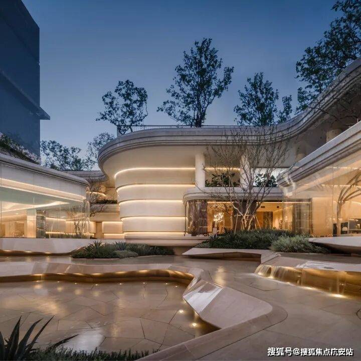因项目整体抬高,从下沉庭院到架空层“空中花园”的落差极大,形成独特的峡谷地貌,杭序府的设计团队汲取九溪烟树为造园灵感,打造一个立体多维的城市溪谷交互园林;因项目毗邻江岸,杭序府的外立面以“站立的江潮”为灵感,