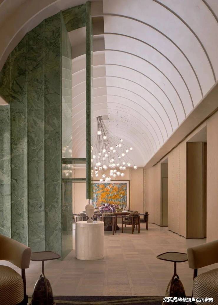 地下一层规划沉浸式主题会所,囊括行政酒廊、棋牌室、红酒雪茄吧、茶室、恒温泳池、SPA馆、健身房、瑜伽室和私宴厅等功能空间。其中270°观景泳池以45°探入庭院,业主在游泳时就可以无界欣赏下沉庭院跌水景观。