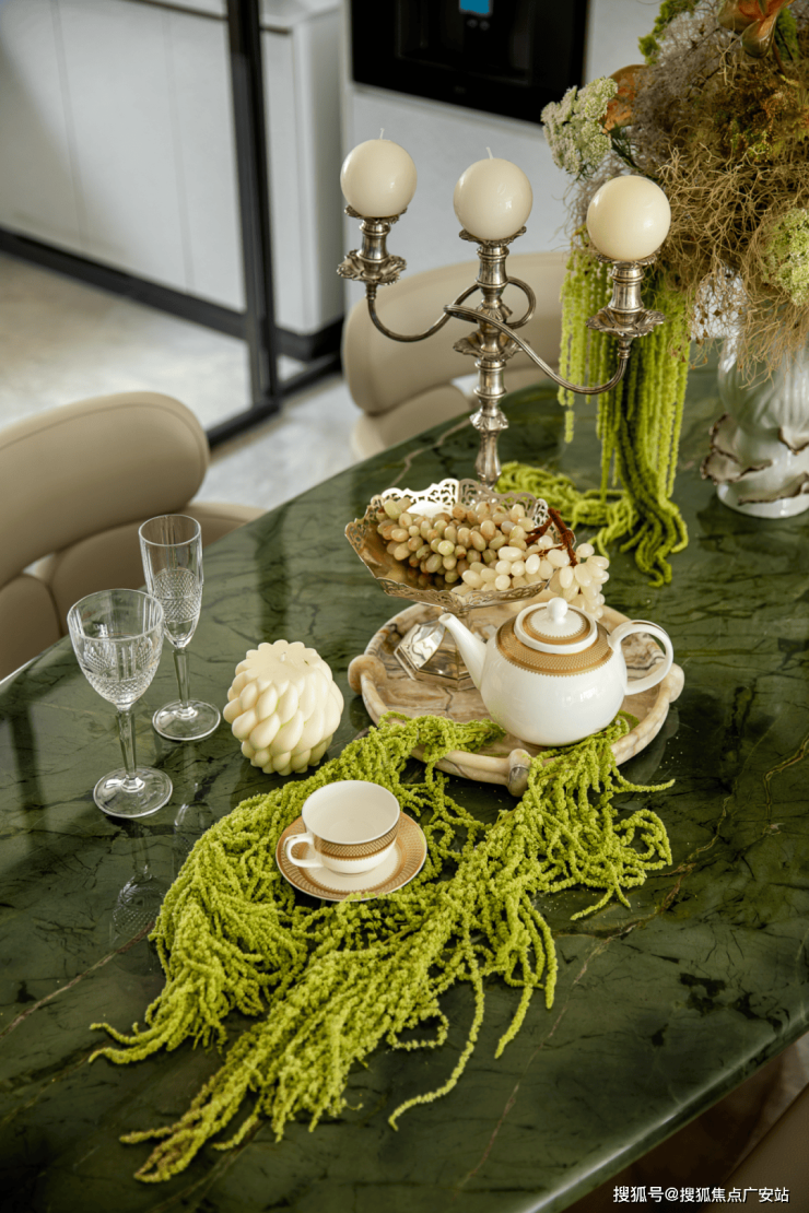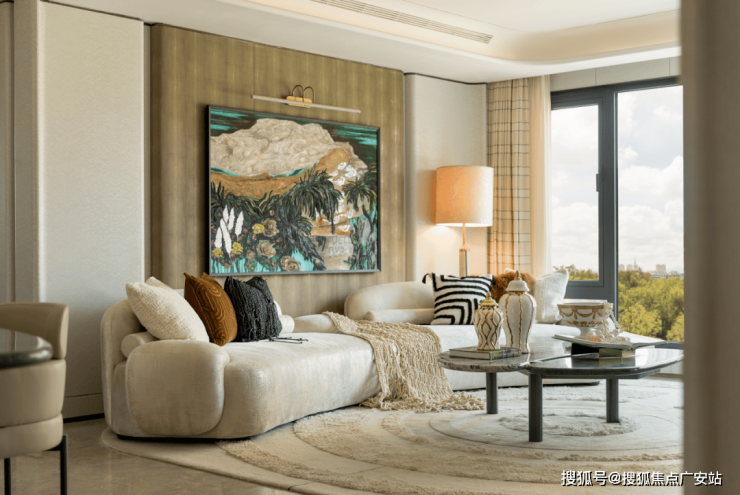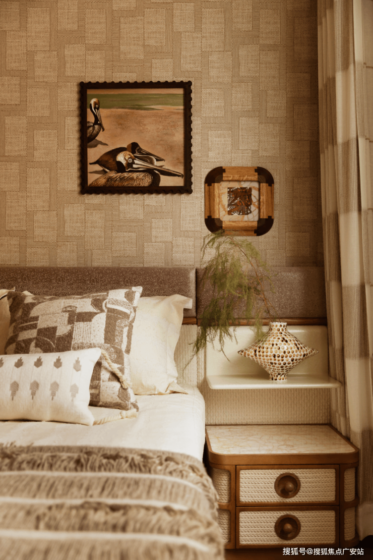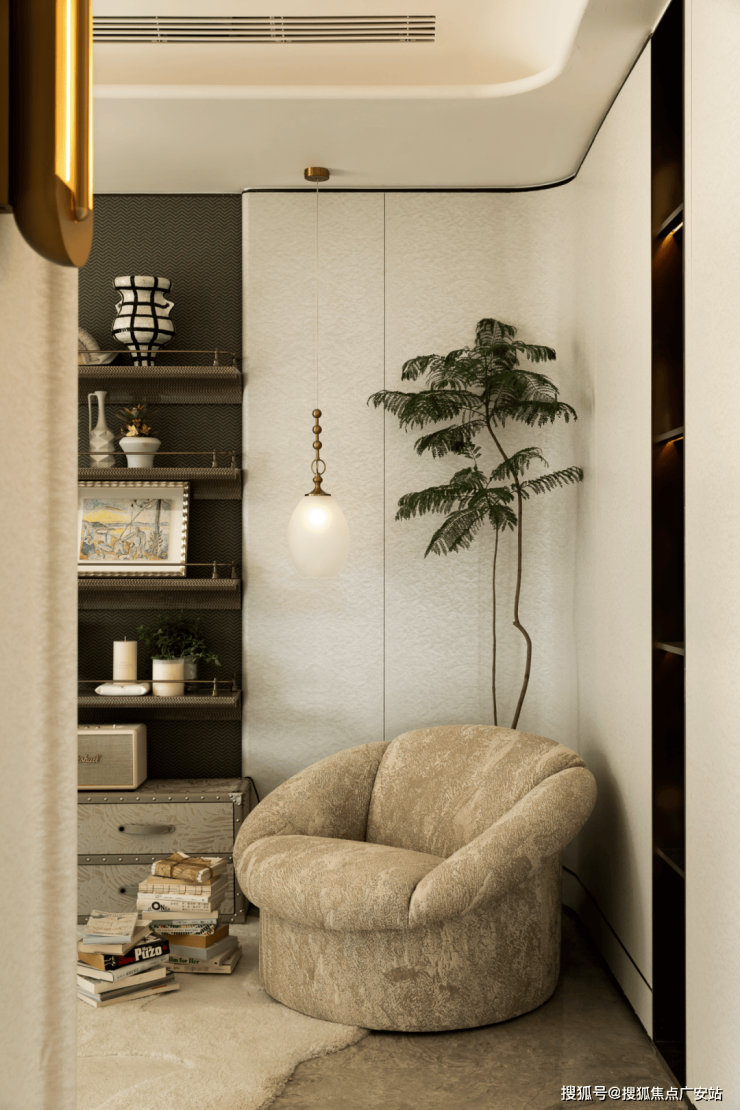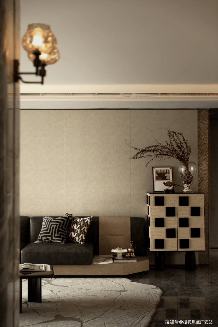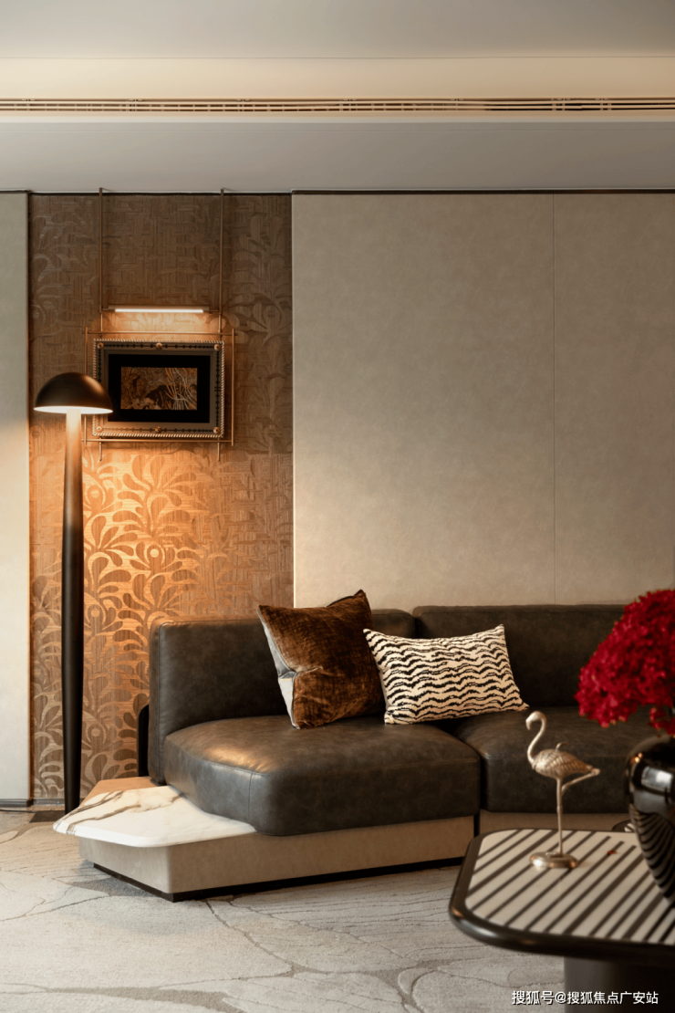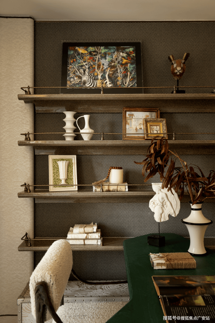私密场域依旧保持静谧,黑白色基础上搭配了更多的色彩,例如深棕、浅紫等,艺术品的衬托深邃迷人,热络了家的氛围。