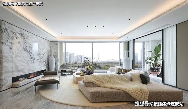 东区建面约320户型,将艺术感进一步融入日常中。特别设计的专属门厅空间,是从电梯厅延伸到家,如同一处艺廊,放慢人的情绪;室内选用了浅金色奢石(外界也称其为“芬迪白大理石”)作为主要的石材,曲面的木饰面也为浅色,整体给人以明亮感。