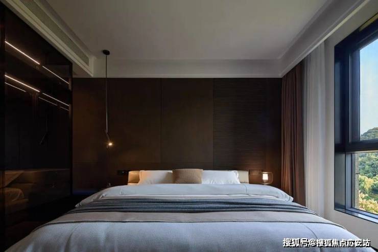 艺术感不仅体现在空间环境的营造,细节的处理和材质的选择也透漏出时尚气息.大气中又不失生活的趣味.皮质有纹理的软包,无主灯的设计,每一处细节都体现着轻奢感.地毯、床品和吊灯的相互映衬,营造出自然舒适的空间氛围,增添了卧室的温暖气息.