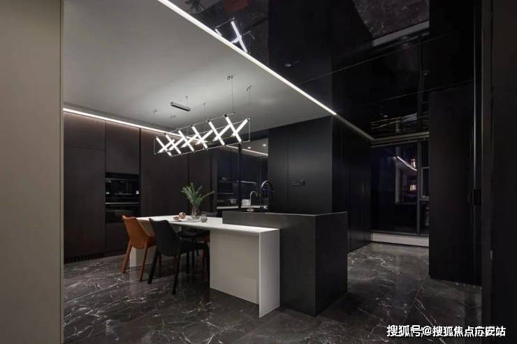 与客厅相比,餐厅对黑色的运用更为多元.设计师巧妙地运用不同材质,吊灯与精致器皿相得益彰,一幅城市墨画定格了时间,伴随着富有格调的三餐四季.