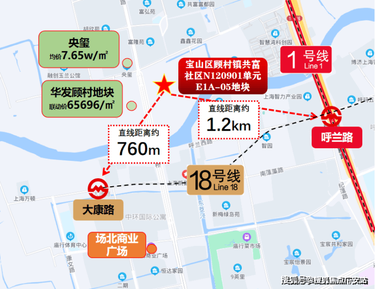 项目地块位于宝山区顾村板块,属于外环内,距离1号线呼兰路站直线约1.2km,18号线二期大康路站(在建)直线约760m。