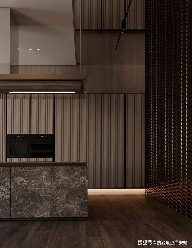 整个餐厅的墙壁和天花板全部使用可视镜作为装饰,把客厅和餐厅的风景全部融合在一起,餐厅的餐桌和大理石岛台完全烘托出现代的氛围感。
