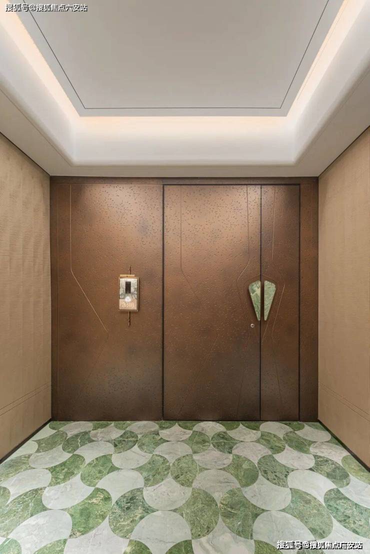 细节处,奢石与影木交相辉映,以水刀拼花工艺铺就艺术长廊,从电梯厅延伸至室内;大师美学灵感的奢雅渗透生活每一处肌理。
