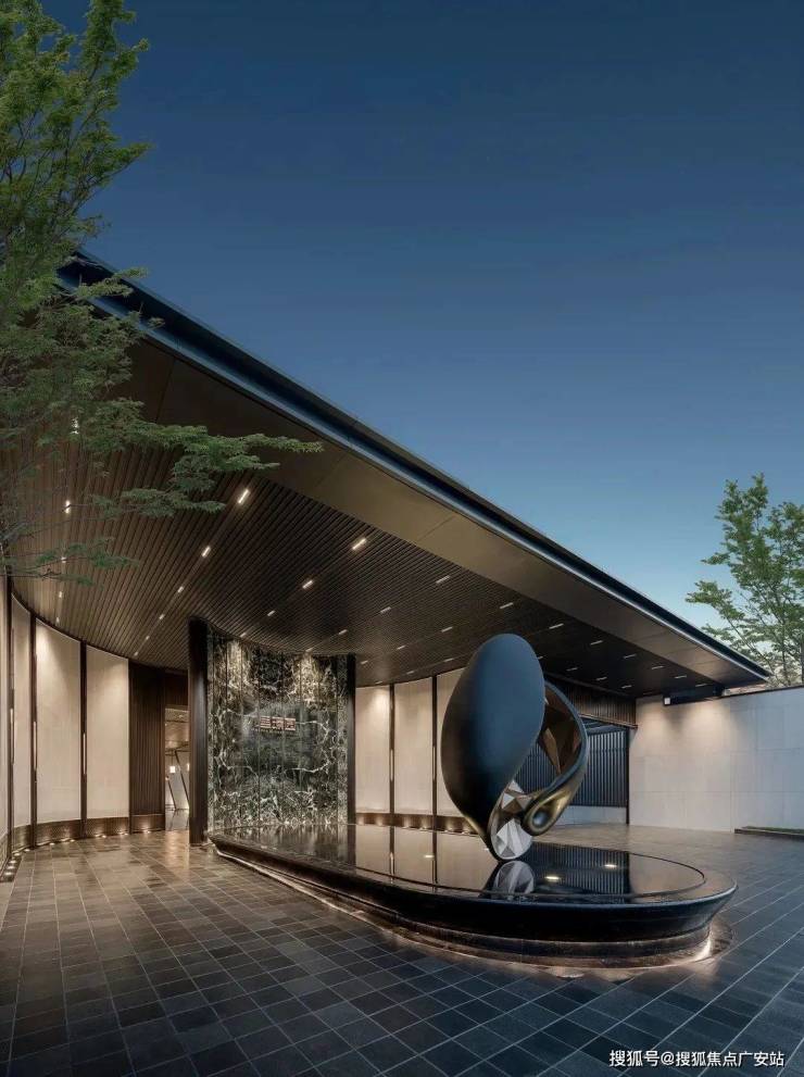 约38m奢感门庭,进深约20米的尊享落客区,承袭中式府邸的对称性布局。中央雕塑取意“苏州之心”整体呈现水滴造型,内部肌理犹如钻石切割。主入口景墙,甄选豪宅御用Prada绿奢石,弧面一体切割,仔细观察便可发现,整块石材纹理上下对称,龙头栩栩如生,犹如双龙出海,象征“鸿运当头”,归家第一步便是星级酒店般的仪式感。
