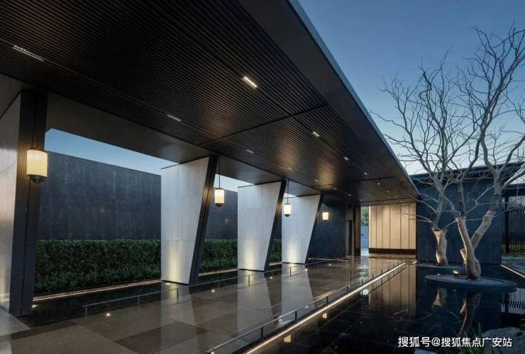 入口空间设计参考留园收放相间的造园手法,走进两侧略显狭长的廊道,穿过类似中式建筑的府门,迎宾庭院尽显眼前。尊崇归家礼序由此开启。