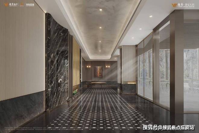 The ground floor lobby, Brazil imported stone Thames stone and light texture stone to form a visual collision, combined with gold liquid metal paint and dark wood finish, to create a low-key low-key tone, in addition to the ground lobby, Yuexiu Jingan Tianyue basement is also amazing, the unit drop-off area to create a bright light hall, so that owners driving home can also feel the warm welcome.