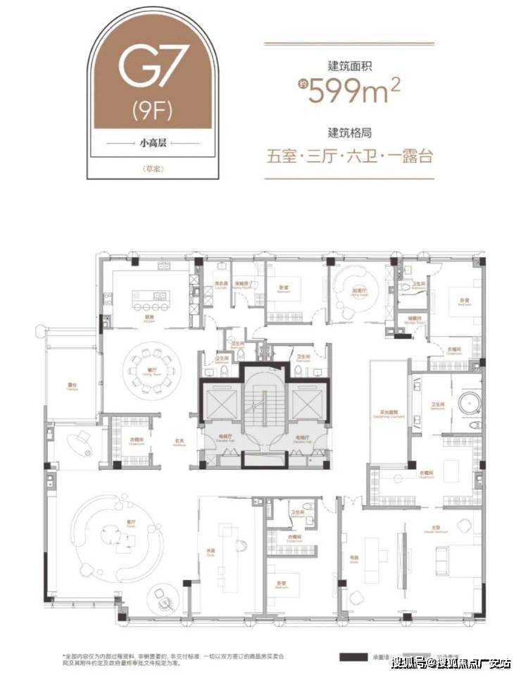 风貌平层的主体,源自巴西进口的紫点金麻石材。阳光照射之下,会有紫色光彩点缀于金色奢石之上,构建出一种恬静优雅的美感。