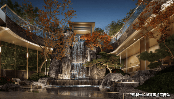 社区入口的施华洛世奇“金韵云光”雕塑,是“九相园林”的开篇仪仗 ——8.2万颗水晶与4.3万片金箔手工缀合,日光下碎光流转。循光入园,动线随景致自然延伸:600吨中国黑原石叠筑的7米飞瀑水声渐起,200万级300年黑松自成景致,搭配鸡爪槭、乌桕等名贵绿植,光影、水声与松影交织,让每一步游园都藏着层次与意趣。