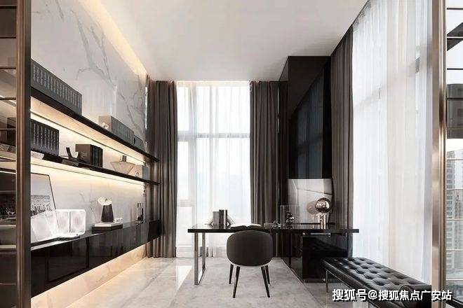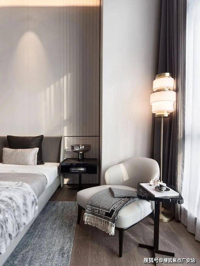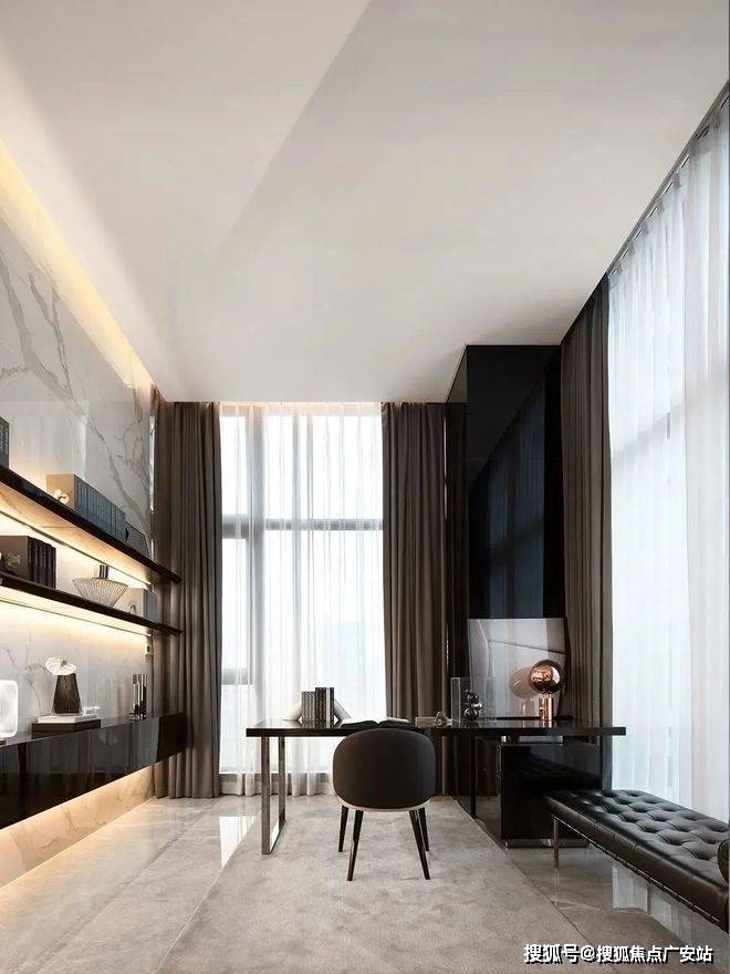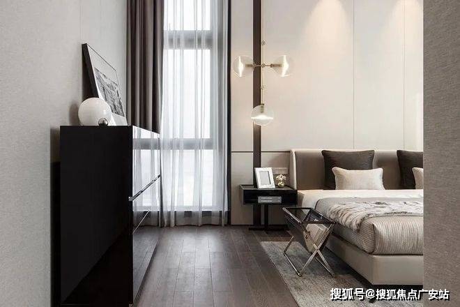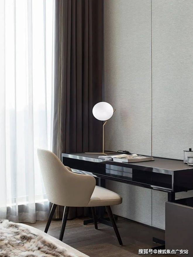 主卧空间以浅色调为主,搭配深色的窗帘让空间有了对比,从而让空间更加丰富,黑色的地板看上去更稳重,卧室空间采用落地窗来采光,空间中色彩分明,给人十分舒适的宜居感,在卧室的一侧还设置了工作区,在功能上营造了方便。
