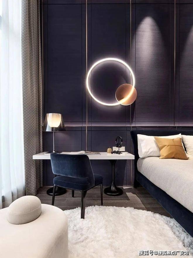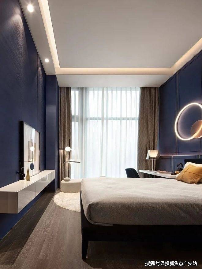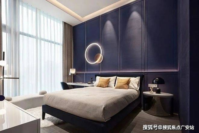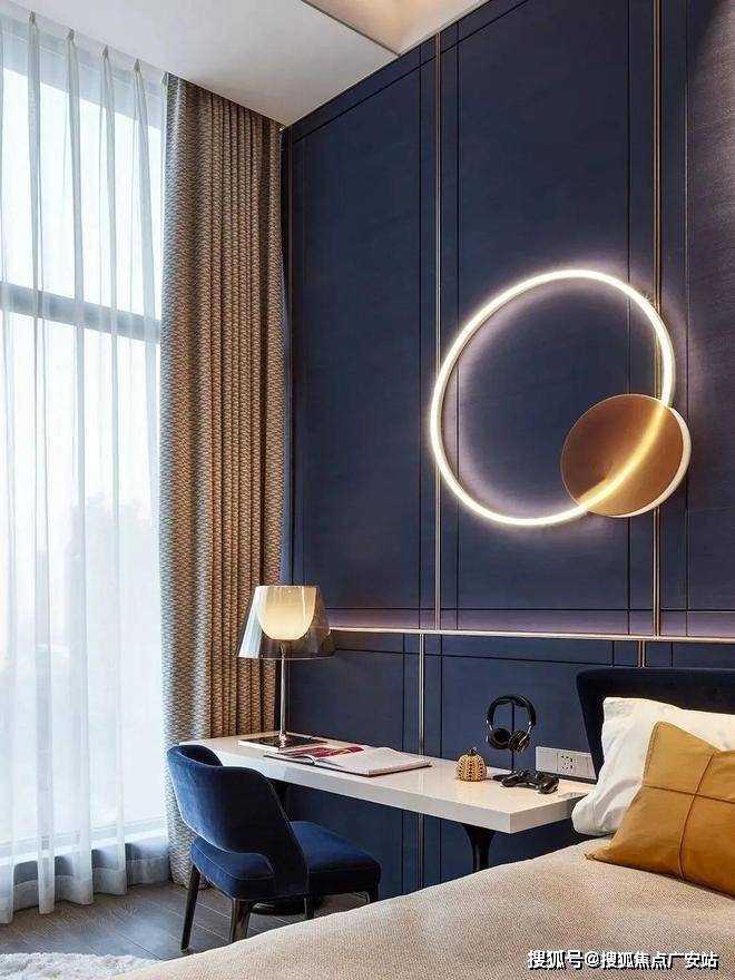 次卧采用蓝色背景墙,跳色的运用使得这个空间更加丰富,这个空间的灯光和各种摆件的运用都很精致,营造出了十足的舒适感。
