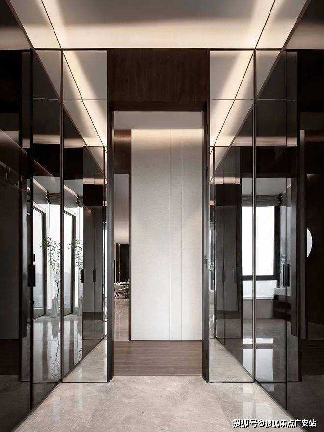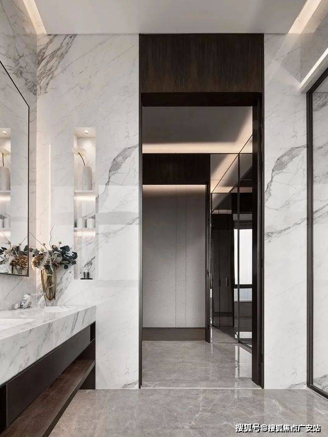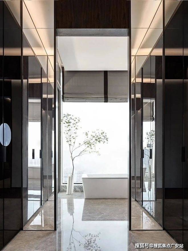 通往卫生间采用反光玻璃,让空间更加有层次,卫生间整体大理石的墙面更加大气干净,依然采用落地窗采光能带来更加舒适的沐浴体验。