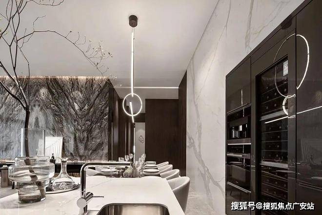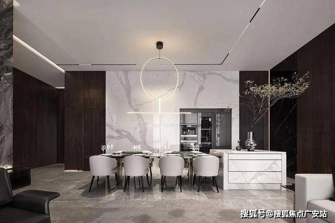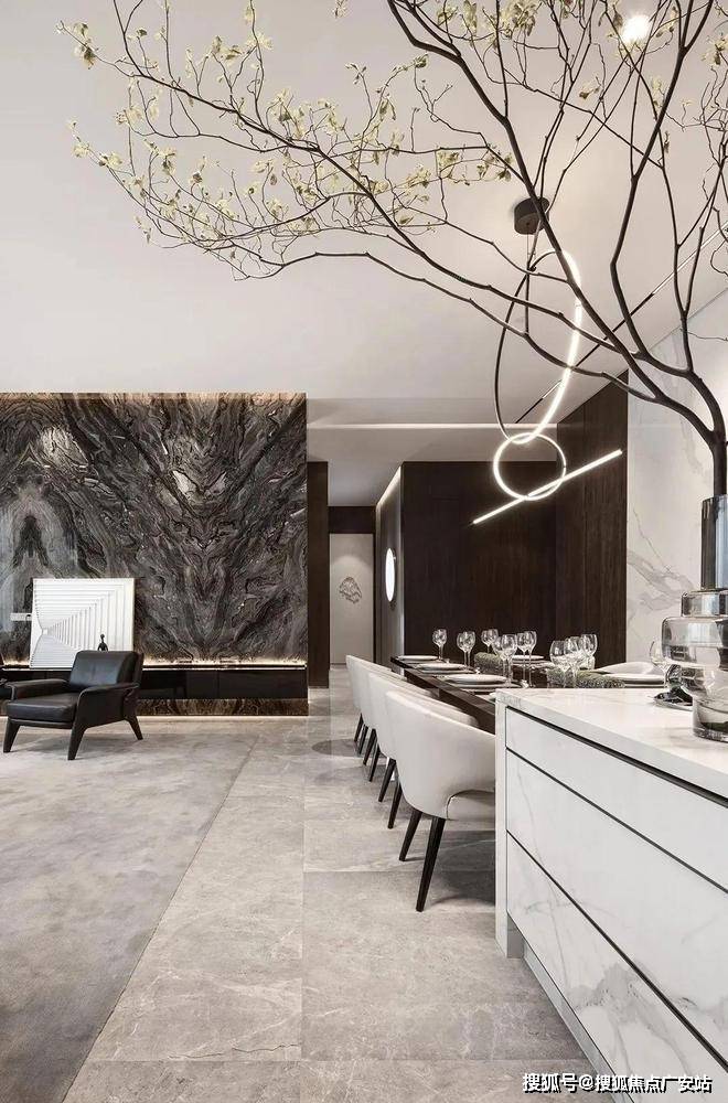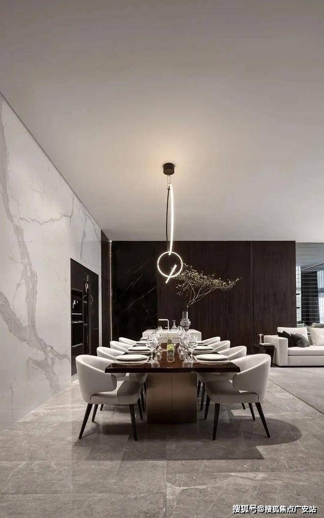 餐厅整体的设计风格和客厅的相差不大,依然以黑白为主色调,白色的大理石背景墙与客厅的背景墙相呼应,略带轻奢风的餐桌搭配绿植看上去很协调,给这个空间带来了生机。