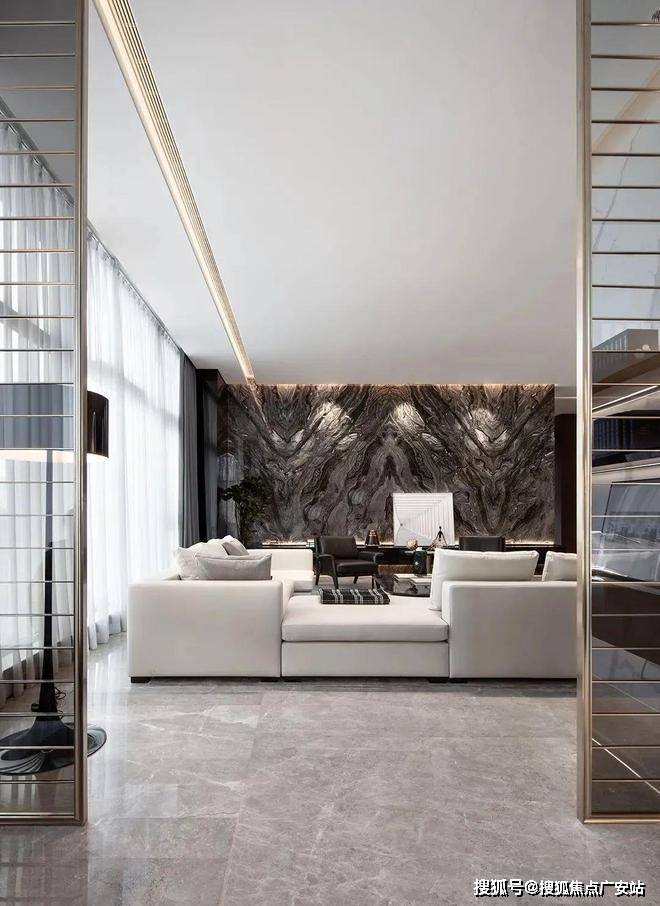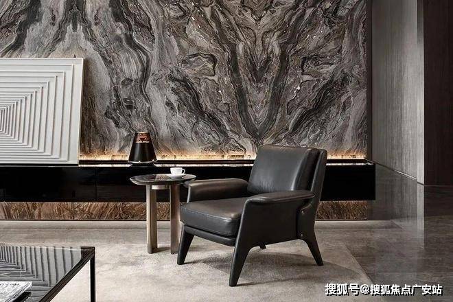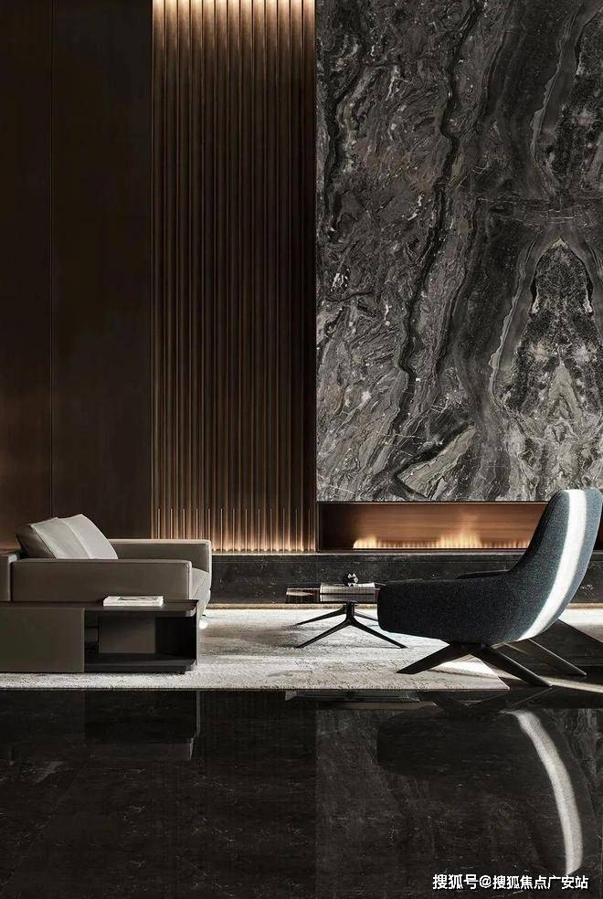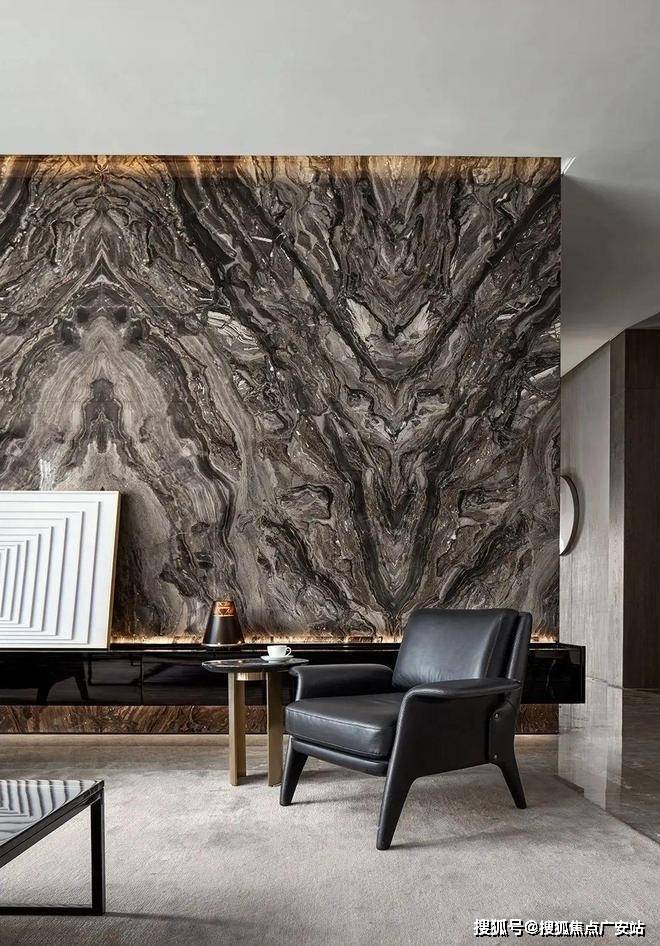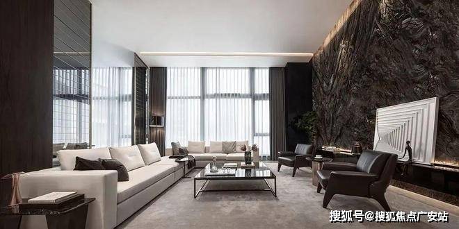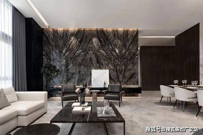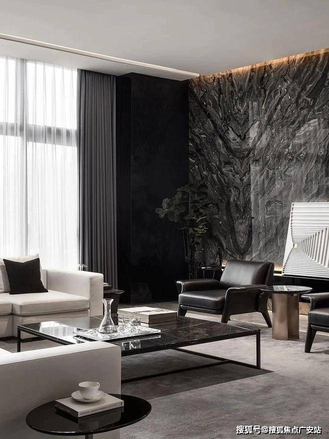 客厅的色调比较鲜明,这样的色调让客厅看上去更加有质感,整面的黑色纹理大理石背景墙大气十足,落地窗带来了优质的采光,黑白家具和墙面颜色的搭配让这个空间体现出更多的质感和高级感。