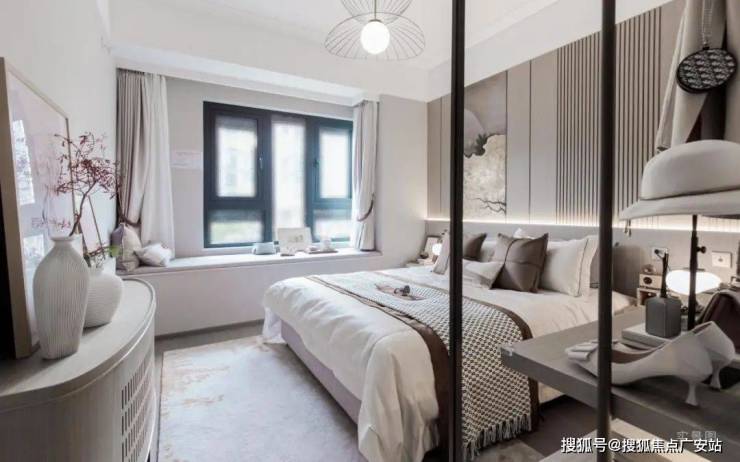充满高级感、整洁感和层次感并存的主卧套房设计,通过约800mm飘窗和大面积窗墙比对空间进行延伸,以精致的衣帽空间进行功能的区隔,营造一个专属于自我的时光。当晨光初照,当晚霞晕染,对望园里的翠意与芬芳,享受难以言喻的惬意与浪漫。