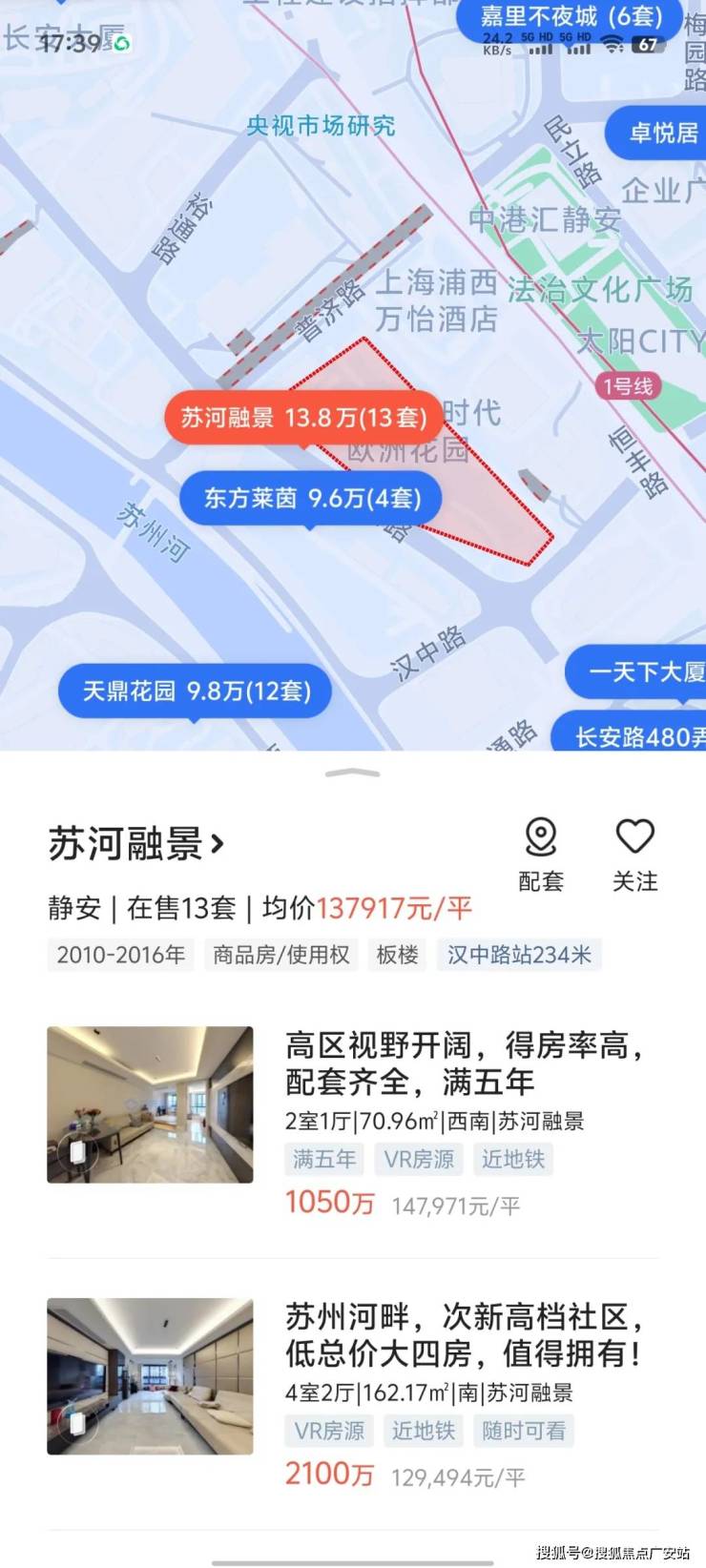 苏河融景整个小区由汉中路、长安路、普济路与恒丰路围合,临近汉中路地铁站和苏州河滨河景观带。苏河融景整个小区分2期开发,其中1号2号一期开发,其余楼栋二期开发。