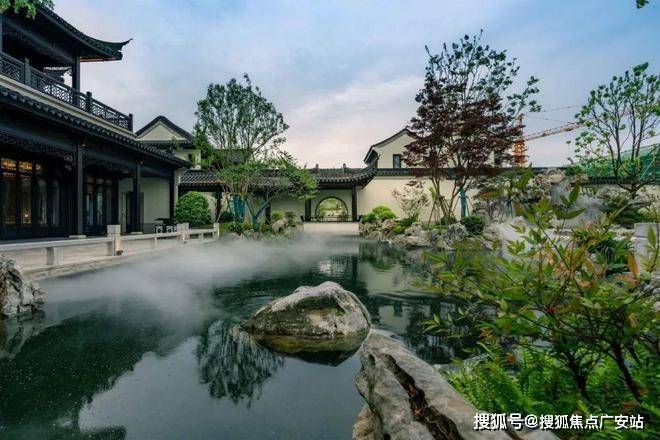 江南园林甲天下,苏州园林甲江南,比如像我们现在看到的园林布局,就是经典的苏州园林景观,讲究引水入园。造景围绕着这片水景展开,空间上比较有层次感。近景是流水、堆石,中景是连廊、假山,远景是中式合院的院墙、屋檐。