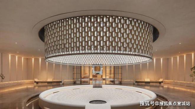 浮光池院水院会客厅,现已实景呈现,水景中央的艺术小品,如一滴水在湖面晕开,泛起阵阵涟漪。