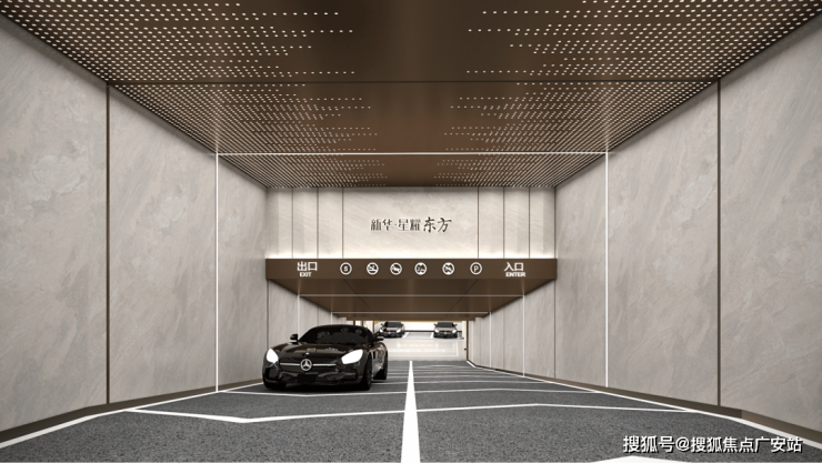 入口对行人、机动车进行优化分流,保障业主安全;而地面停车位,方便参观者、业主等临时停车的需求。另外在车库上,项目还打破了常规地库的单调、晦暗。直接将豪车专属的星空顶搬入了地库里。从车行驶入地库的那一刻开始,一场名为“宏大”的归家之旅就开始了。通道入口,顶部优雅的星空放射灯,展现出浩瀚星空般的深邃、璀璨,搭配两侧的高级铺面材质,尽显奢华气质。