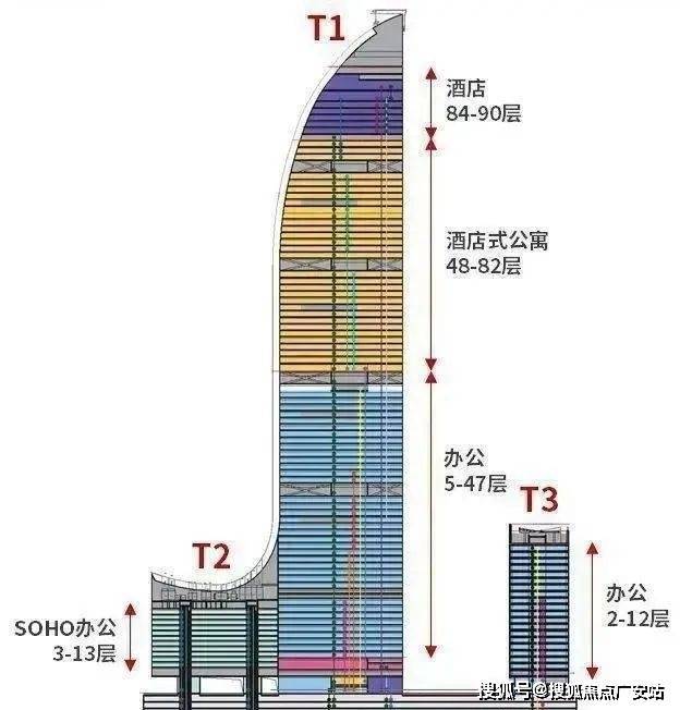 T1主塔楼是集办公、公寓、酒店为一体、高450m高的超高层综合体;